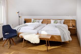 • Chalet - Schlafzimmer mit zwei 120 cm breiten Massiv - Eichenbetten (zum "King - Size" Bett wandelbar), Tisch, drehbare Relax - Polsterstühle, Flachbild - Fernseher mit Schwenkarm, Radio, WLan